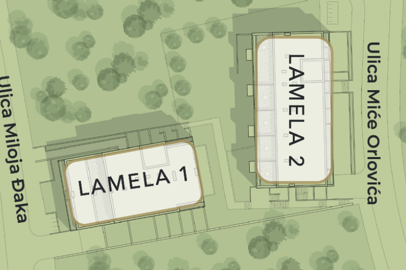 Kompleks je koncipiran tako da pešački i kolski pristup Lameli 1 je iz ulice Miloja Đaka, a Lameli 2 iz ulice Miće Orlovića. Izlaz na dve ulice omogućuje svakoj lameli da funkcioniše nezavisno i bez gužve, a opet povezano u korišćenju velikog dvorišta od preko 300m2 kao i ostalih zajedničkih kapaciteta.